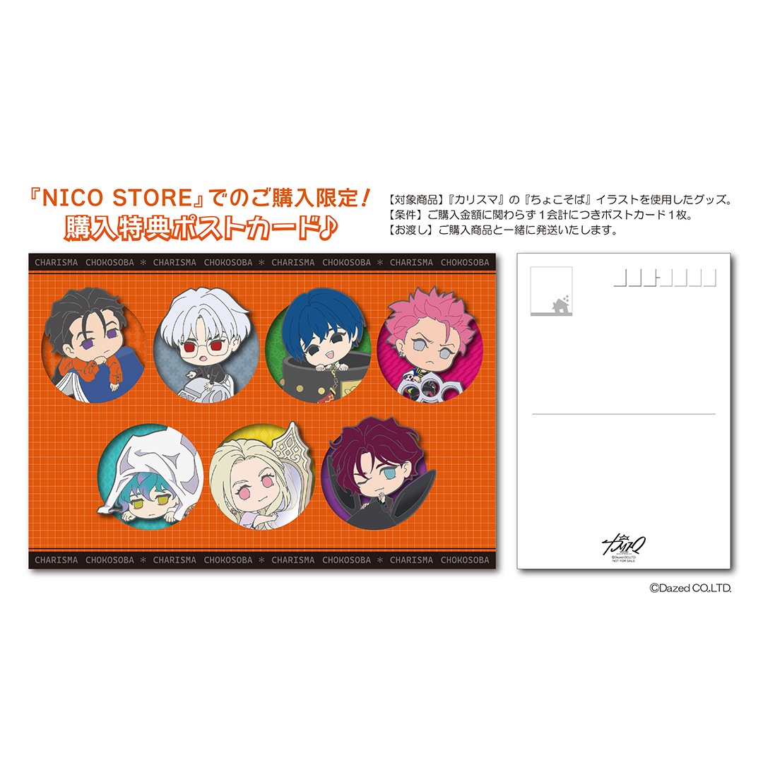 【対象商品】『カリスマ』の『ちょこそば』イラストを使用したグッズ。/【条件】ご購入金額に関わらず1会計につきポストカード1枚。/【お渡し】ご購入商品と一緒に発送いたします。